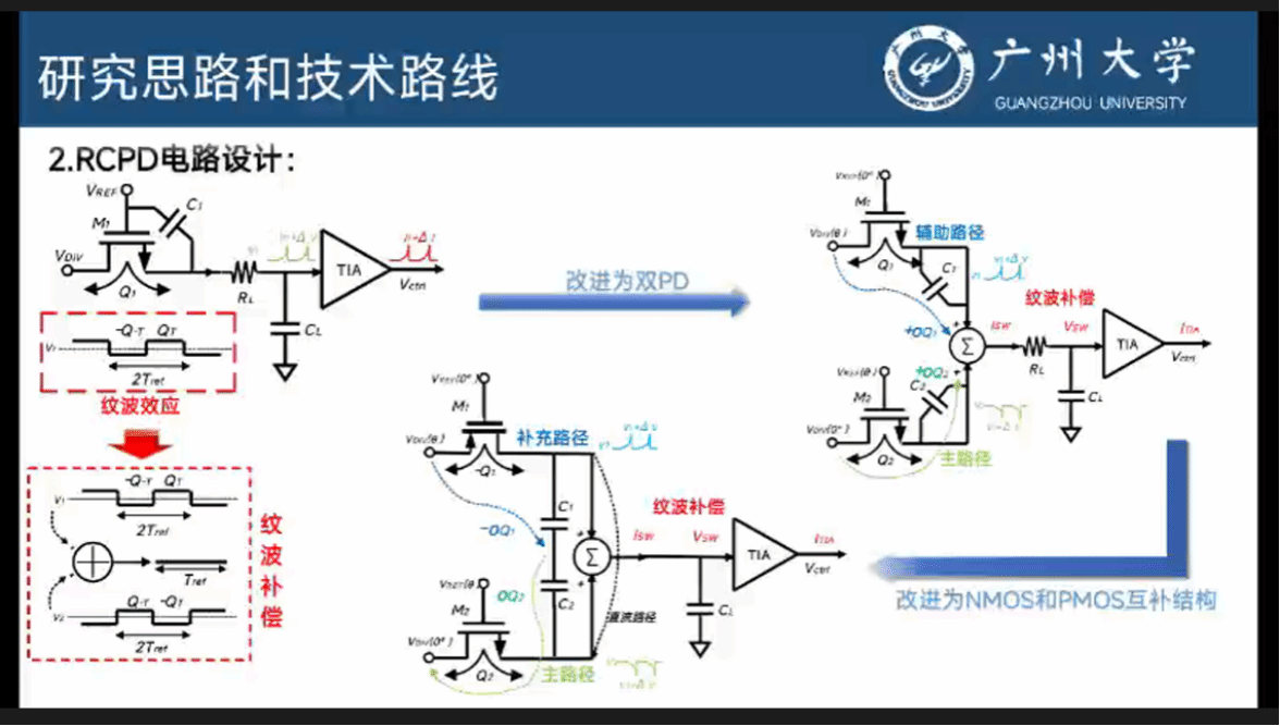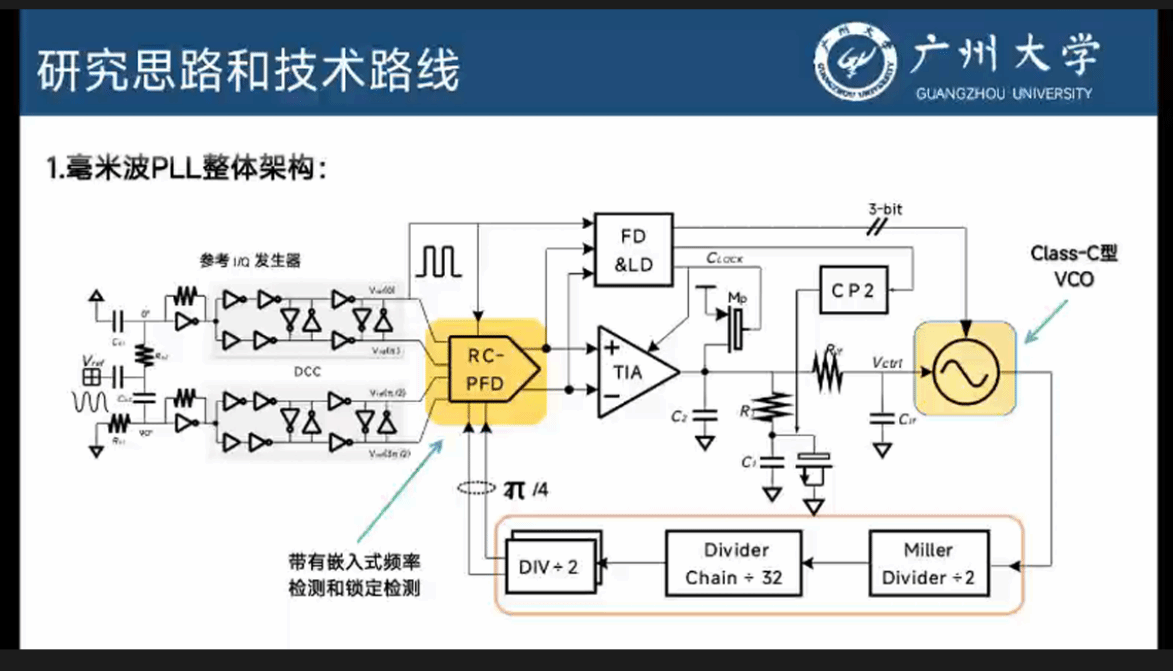 金雯同学提出一种结合纹波补偿相位检测器和动态校准技术的毫米波PLL架构。核心思想在于通过利用NMOS与PMOS开关对的电流复用机制,在电流域内实现双相位检测器输出纹波分量的自平衡,从而有效抑制周期性扰动所引入的参考杂散。相较于传统的单PD,该方法在原理上避免了纹波信号的直接输出,提升了杂散抑制能力。同时,为进一步提升RCPD的性能并降低工艺偏差的影响,本研究引入了一种动态校准机制,通过扫频路径和决策路径完成校准状态的锁定,并对互补相位检测器的尾电流进行实时调整,以增强系统在不同工艺条件下的鲁棒性。为拓展该架构的功能,将RCPD扩展为RC相位/频率检测器,使其不仅具备相位检测能力,同时集成了频率检测与VCO锁定状态检测功能,该设计思路为实现快速频率捕获和稳定锁定提供了新的技术方案,能显著改善毫米波PLL的整体锁相性能。