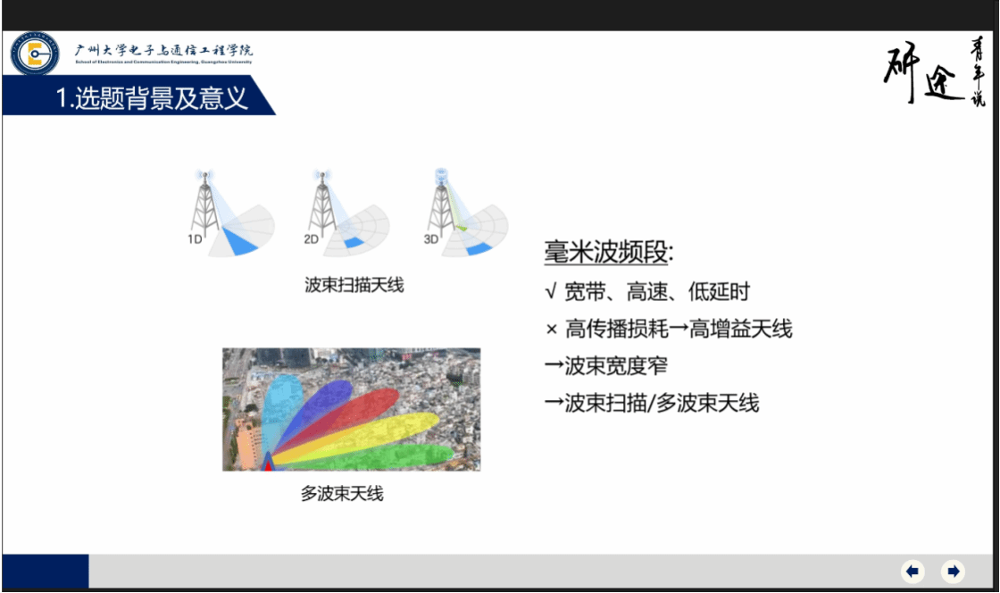 龚俊同学的工作为对透明多波束菲涅尔透镜天线展开研究,该天线采用了两种相位状态(0°、180°)对电磁波相位进行补偿,采用空气圆环实现0°相位补偿区间,180°相位补偿区间则通过一种透明3D打印材料实现,这样的设计有效地简化了透镜结构,使得该透镜能够更容易被打磨以获得更高的透明度。为了验证该天线的多波束性能,设计了一个磁电偶极子天线阵列作为馈源激励透镜。该研究已完成天线样品的加工和测试工作,测试结果表明该透镜天线具有22.2%(28 - 35 GHz)的相对带宽,在工作频段内可以实现最高21.7 dBi的增益和最大±20°波束覆盖,且具有94.1%的透明度。其透明的特性使其能够部署于建筑楼宇窗户表面来增强室内信号,同时还不影响室内的采光和建筑的美观。