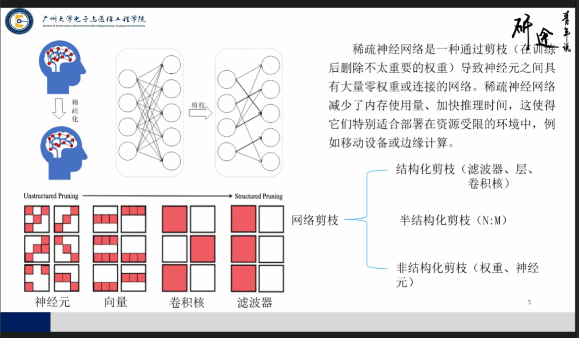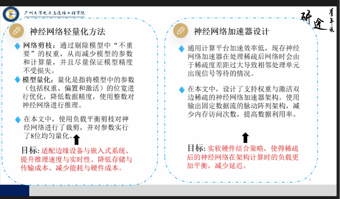 郭煜同学以三部分展开分享,第一部分是选题背景与应用,对 DNN 应用场景的优势进行介绍;第二部分着重于解释本文使用的负载平衡剪枝与量化方法,首先介绍了该剪枝算法的框架,接着对剪枝后的模型进行微调,并对稀疏网络模型进行 8 位均匀量化,最后用该剪枝与量化策略对VGG-16 和 ResNet-50 进行了实验测试;第三部分提出了一种双边稀疏脉动阵列神经网络加速器设计,该部分首先介绍了加速器整体架构设计,然后详细解释了整个加速器使用的数据流,接着对加速器内部的 PE模块和稀疏筛选模块进行了详细介绍,然后对本文使用的稀疏矩阵压缩格式进行了介绍,最后用实验验证了所设计的加速器的可行性。