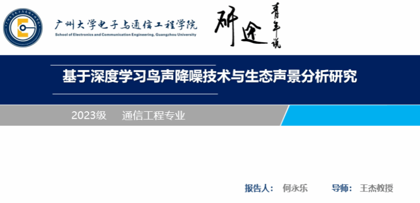 何永乐同学汇报的主题是基于深度学习鸟声降噪技术与生态声景分析研究,他的讲解主要包含以下5个部分:选题背景及意义、现状与研究目标、研究方法及过程、研究结果与应用、论文总结。本研究聚焦复杂噪声对生态声学分析的干扰问题,以黄茅海跨海通道区域为研究对象,构建基于改进 BSRNN 模型的鸟声降噪与声景评估框架。通过 “低频细化、高频粗化” 的频带分割策略,模型在多源噪声场景下表现优异,显著优于传统及其他深度学习降噪方法。研究验证了降噪处理可有效提升其与生物多样性的相关性,并恢复声景日变化生态节律。该研究填补了深度学习降噪在生态声景分析中针对性应用的空白,为工程区域生态监测与生物多样性保护提供了可靠技术支撑。