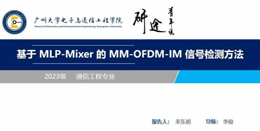 米东旭同学汇报的主题是基于 MLP-Mixer的 MM-OFDM-IM 信号检测方法,他的讲解主要包含以下4个部分:研究背景与挑战、所提方法与框架、实验结果与结论、论文总结。 围绕 MM-OFDM-IM 系统信号检测展开,核心是提出 MLP-Mixer 检测器解决性能与复杂度矛盾。背景中,MM-OFDM-IM 虽高频谱效率,但传统 ML 检测复杂、LLR 依赖信噪比,现有 DL 检测器泛化弱且难抓全局特征。