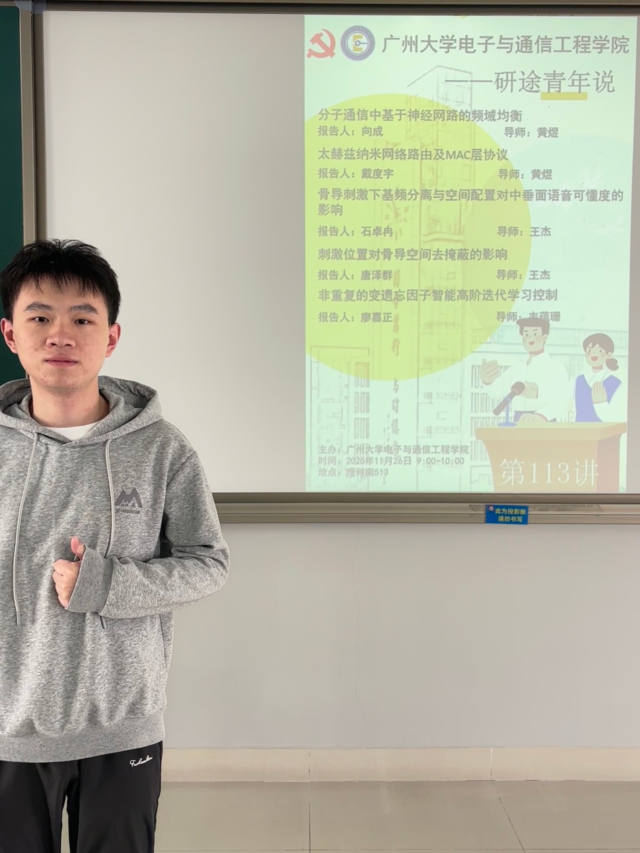 主办的“研途青年说”第113讲于11月26日9:00-10:00在理科南513举行。本次主讲人为23级研究生向成、戴度宇、石卓冉、唐泽群和廖嘉正。