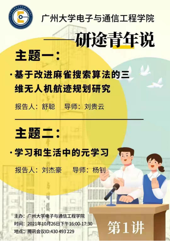 主办的“研途青年说”第1讲于10月26日下午16点-17点30分由在线上(腾讯会议)和线下(B3栋910会议室)同时举行。本次的报告主题是: 基于改进麻雀搜索算法的三维无人机航迹规划研究、科研和生活中的元学习。报告人分别为舒聪、刘杰豪。刘贵云、杨钊等老师出席本次活动。