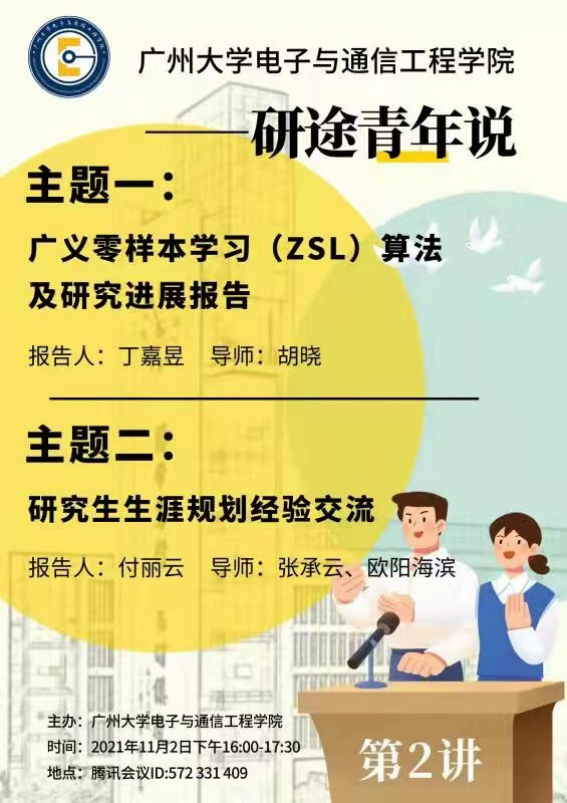 主办的“研途青年说”第2讲于11月2日下午16点-17点30分由在线上(腾讯会议)和线下(B3栋910会议室)同时举行。本次的报告主题是:广义零样本学习(ZSL)算法及研究进展报告、研究生生涯规划经验交流。报告人分别为丁嘉昱、付丽云。胡晓、张承云、欧阳海滨等老师出席本次活动。