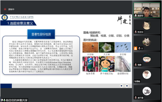 杨佳信首先介绍了图像处理中的五个主要步骤:图像的预处理、检测、分割、识别以及分类,并从研究背景方面解释了何为显著性目标检测以及为何需要进行显著性目标检测。其次,杨佳信结合实际图像例子,深入浅出地为同学们阐述了三种常见的显著性目标检测方法。随后,杨佳信对他目前的研究内容进行了详细地讲述。对于一个给出的数据集,应先关注该数据集的主要特点以及其视觉任务所面对的挑战,再依据相应的目标对其进行有针对性的处理。考虑到处理算法主干网络的变换会提升设备成本且不利于各类研究方法的对比,杨佳信更建议同学们在注意力机制模块和感受野模块处做进一步研究,用以提升处理的精度。最后,杨佳信对其目前的研究成果进行了简单地介绍。