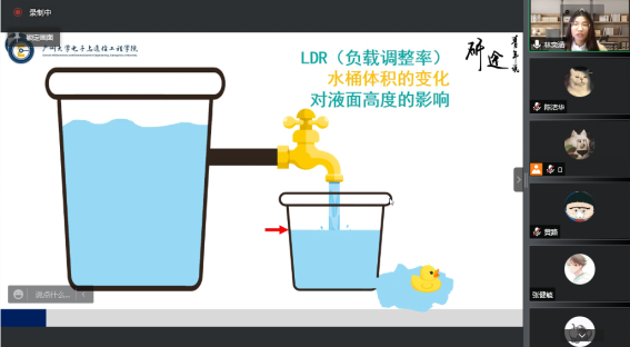 林奕涵首先向同学们介绍了电源管理芯片这一大方向下的几个小支线:线性稳压芯片、电压基准芯片、开关电源芯片以及LED驱动芯片。随后,她利用动画的形式,将电流比喻为流动的水,电压比喻为液面高度,形象生动地为同学们讲解了何为线性稳压器以及用于衡量稳压器好坏的四个性能指标。此外,林奕涵还从实际流程的角度讲述了芯片设计这一从无到有的过程,让同学们对自己往后的研究方向有了更为清晰的认识。最后,林奕涵还着重介绍了她的毕业课题——基于热电能量采集的升压转换器芯片的研究与设计。在此期间,林奕涵不仅分析了目前能量采集芯片国内外的研究现状与技术难点,还为同学们逐模块的讲解了所研究课题的整体框架图。