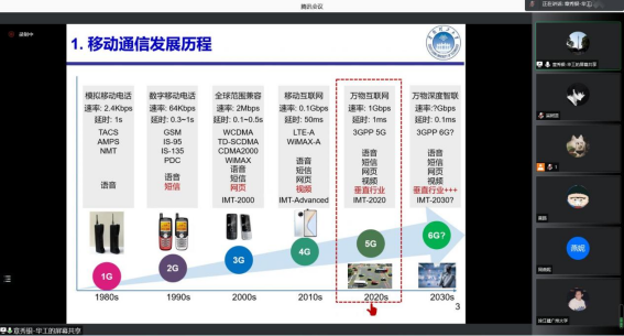 章秀银教授首先对移动通信发展历程做简要的介绍,其次以5G技术的发展和6G移动通信研发为背景阐述5G/6G射频与天线,包括5G/6G移动通信天线和5G/6G移动通信射频芯片两个部分。章秀银教授讲解了Sub-6GHz天线,毫米波天线,Sub-6GHz芯片,毫米波芯片等研究热点,从研究思路,研究成果,未来的研究展望等方面向同学们进行了详细的阐述和分析。报告内容深入浅出,参会人员认真学习并就有关问题进行互动问答。