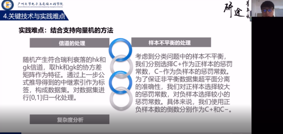 第二位进行分享的是罗杰,罗杰首先分享的是选题背景及意义:在多中继网络中,中继选择方案不仅可以简化信令,节约能源成本,而且可以保持大部分的系统性能。联合波束成形和中继选择设计能够提高系统的吞吐量,但是也增加了系统的复杂度。他是通过穷举搜索可以获得最佳的中继组合选择,同时根据迹的性质和克罗内克积的性质对优化问题进行化简,引入波束成形设计,目的是求出最大特征值,并且得到对应的中继索引。此外,他还介绍了实践难点是信道的处理、样本不平衡的处理以及复杂度分析。基于这些基础上,他给出了四个不同方案的平均可达速率比较图象,这四个不同方案分别是“支持向量机(改进方法)”方案、“支持向量机(原始方法)”方案、“穷举搜索”方案和“随机选择”方案。从图象中可以明显地看出,“穷举搜索”方案可以获得最高的平均可达和率。在不同发射功率的中继下,“支持向量机(改进方法)”方案的性能优于“支持向量机(原方法)”方案,验证了对样本不平衡特性的处理是有效的。最后,他对自己的研究内容进行了总结:主要是通过多中继和波束成形设计,最大限度地提高在中继的各个发射功率约束和中继选择约束情况下所能达到的速率。