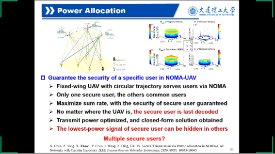 赵楠教授首先对无人机通信进行了简要介绍,并提出利用无人机通信解决目前移动通信中面临的问题,接着赵楠教授汇报了五个研究方向:一是无人机实现长距离传输,提高无人机于不同场景的泛用性,二是通过无人机搭载基站,对蜂窝网络进行覆盖,并介绍利用多跳D2D扩大覆盖范围,无人机结合非正交多址以提高覆盖用户数的方法。三是无人机通信安全,通过控制安全用户发射功率与非正交多址以隐藏安全用户信息。四是绿色通信,优化功率分配。五是智能反射面,利用智能反射面辅助无人机进行安全传输等。
