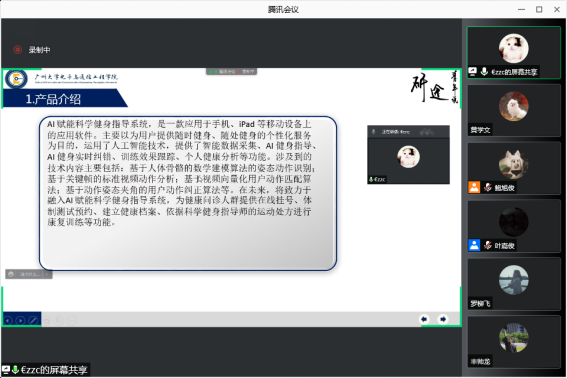 邹章晨首先向同学们介绍了AI赋能科学健身指导系统的功能和技术内容,它的目的是为用户提供随时健身、随处健身的个性化服务。随后,邹章晨介绍了这个系统的三大竞争优势:实时纠错功能、AI技术和采用视频向量化技术。其次,邹章晨向同学们介绍了这个系统的使用流程。最后,邹章晨还向同学们介绍了这个系统的实现流程,这个系统首先将输入的视频流拆分成帧,对每帧图像进行人体检测,然后对检测出的人体做人体骨骼关键点检测进而识别人体健身的动作。