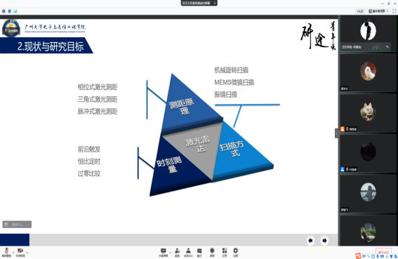 冉晟圭首先介绍了激光雷达的良好性能,并将其应用于车辆障碍的探测。然后,冉晟圭从测距原理、时刻测量和扫描方式这三个方面全面阐述了激光雷达的工作原理。其次,冉晟圭分别介绍了激光雷达的硬件部分和软件部分,硬件部分的设计主要包括三个部分:收发模块设计、信号处理电路设计及旋转扫描模块设计。软件部分的设计主要包括三个方面:PWM输出,TDC控制及距离测量、电极控制及编码器读取、三维坐标的生成。随后,冉晟圭介绍了激光雷达的关键技术及实现难点,激光雷达的关键技术是激光器驱动电路的设计,难点是信号处理电路的设计。最后,冉晟圭通过展示图片的形式向同学们介绍了他的最新研究成果。