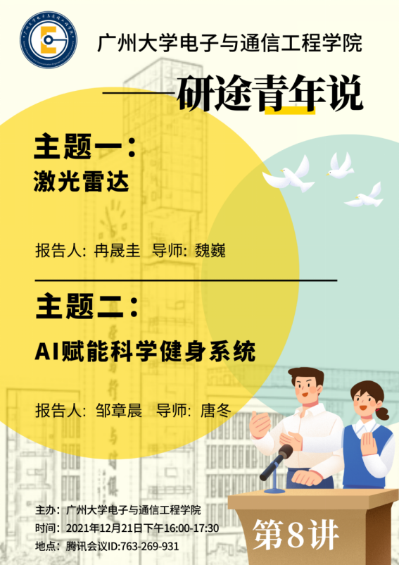 主办的“研途青年说”第8讲于12月21日下午16点-17点30分由线上(腾讯会议)和线下(B3栋910会议室)同时举行。本次的报告主题是:激光雷达与AI赋能科学健身系统。报告人分别为冉晟圭、邹章晨。
