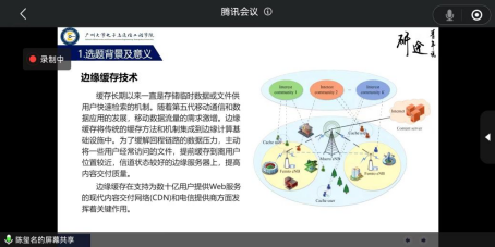 第二位进行汇报的是陈玺名同学,他从研究背景,系统模型,解决问题,总结展望4个方面进行介绍。他首先向我们介绍了边缘缓存技术,提出了目前研究的几个不足,并说明了此研究的目的是为了快速适应时变信道的复杂无线环境,在文件流行度未知的情况下,提出一种在线缓存资源分配算法,降低内容传输过程中的突发误码率,提高交付质量。接着介绍了两个系统模型,分别是无线通信模型和缓存模型。然后具体的讲述了他的研究方法及过程,探索在窄带通信下的突发错误问题,完成了深度衰落误码率(BBER)的推导。最后通过数字仿真验证了该方法的有效性,结果表明其在平均BBER、算法收敛性和快速适应新场景方面,相对于传统预训练算法和DQN算法来说,具有较好的表现。