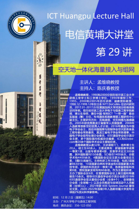主办的电信黄埔大讲堂第29讲,因疫情影响于腾讯会议356-122-050举行。本次大讲堂的主题是:空天地一体化海量接入与组网。主讲嘉宾为哈尔滨工业大学电子与信息工程学院教授、博士生导师,孟维晓,兼任中国-智利ICT“带一路~联合实金室(筹)主任、专用通信系统教育部工程研究中心副主任。2005年获优秀黑龙江省留学人员报国奖,2008年入选教育部新世纪优秀人才计划,2016年遴选为中国电子学会会士,担任中国指挥与控制学会空天防务体系工程专委会常务委员、黑龙江省电子学会常务理事、中国电子学会信号处理分会委员、IEEE通信学会哈尔滨分会主席,多个国际国内权威杂志编委,iCc和Globe-com等20余个国际学术会议主要组织者。本次大讲堂由酒店偷拍