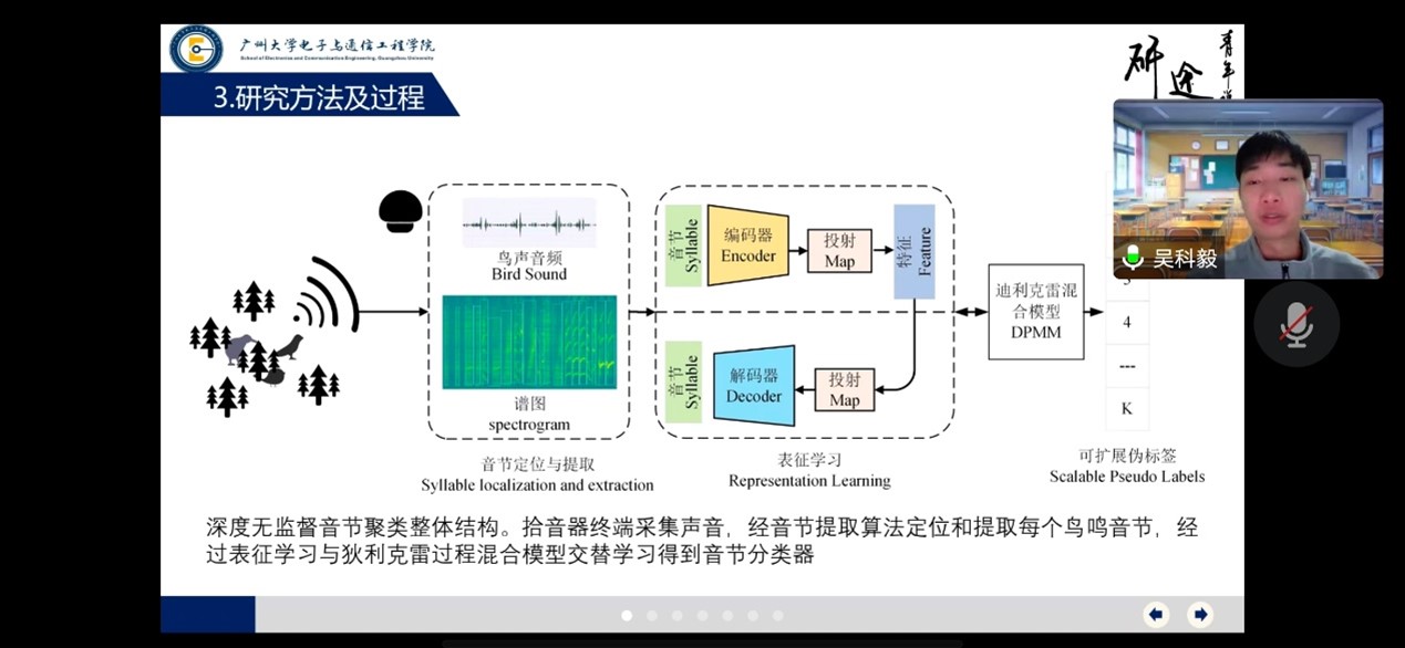 第一个汇报的是吴科毅同学,他从选题背景及意义、现状与研究目标、研究方法及过程、关键技术与实践难点、研究结果与应用、论文总结六个方面展开了介绍。他首先介绍了鸟类发音研究在鸟类识别与鸟类行为研究中的应用,然后简单概括了已有研究方法中,包括有监督音节标注方法和无监督聚类方法。接着,他讲解了研究方法:拾音器终端采集声音,经音节提取算法定位和提取每个鸟鸣音节,经过表征学习与狄利克雷过程混合模型交替学习得到音节分类器。研究过程中涉及的关键技术与实践难点有:准确的音节切分、让模型学习到嵌入特征、音节数量自动推、排除干扰样本。为了解决上述难点,研究过程中采用了了一种多音节分割算法,利用变分编码器表征学习,同时还采用了基于迪利克雷混合模型的自动音节种类推断方法。最后的研究结果显示,在不需要人工标注数据与音节边界划分的情况下,研究过程中所提出的无监督方法能获得接近人工标注数据的有监督方法,为自动鸟鸣音节处理提供了一种可靠的、自动的分析方法。