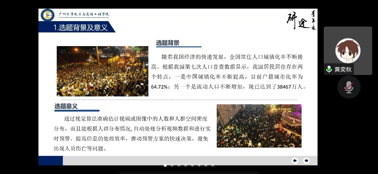第二个汇报的是黄奕秋同学,他首先介绍了研究的背景和意义:通过视觉算法准确估计视频或图像中的人数和人群空间密度分布,并且根据人群分布情况, 自动处理分析视频数据和进行实时预警,提高信息的处理效率,推动预警方案的快速决策。然后他讲解了目前一些相关的研究方法的主要特点和存在的缺陷,随之指出研究过程中的主要挑战为图像中人群图像透视畸变、背景噪声识别等问题会对模型的检测和识别产生严重干扰。接着,他介绍了研究内容,主要有三部分:一是背景噪声抑制;二是上下文感知增强,三是动态感知。最后的实验结果展示了公开数据集上不同算法的MAE与MSE结果比较,肯定了所提算法的可行性。