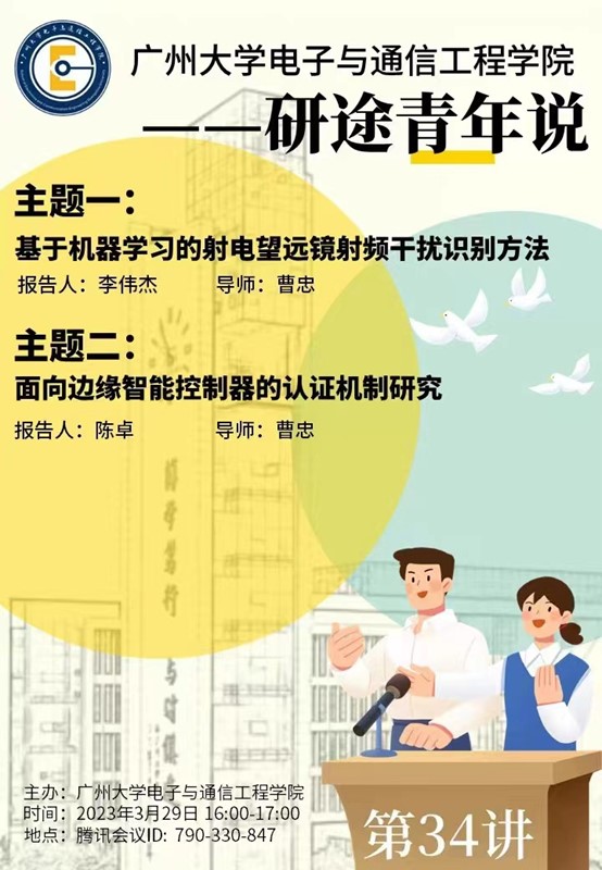 主办的“沿途青年说”第33讲于3月29日下午16:00-17:20在线上(腾讯会议:790-330-847)举行。本次主讲人为20级研究生李伟杰,陈卓,主题分别为基于机器学习的射电望远镜射频干扰识别方法和面向边缘智能控制器的认证机制研究。