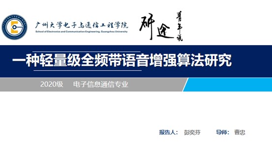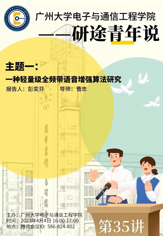主办的“沿途青年说”第35讲于4月4日下午16:00-17:00在线上(腾讯会议:586-824-802)举行。本次主讲人为20级研究生彭奕芬,主题为一种轻量级全频带语音增强算法研究。