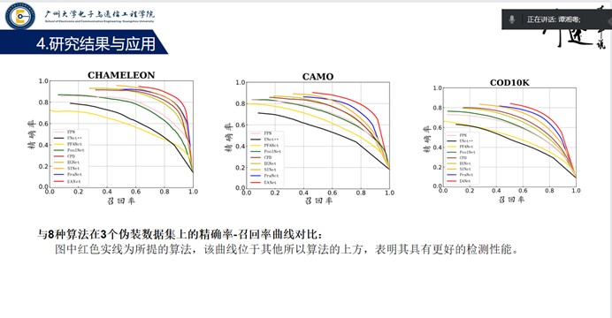 最后在研究结果与应用,我们可以跟随她的讲解得知与11种算法在3个伪装数据集上的客观对比,所提的算法EANet在四个常用的评估指标上取得了整体最优性能;与8种算法在3个伪装数据集上的精确率-召回率曲线对比,所提的算法具有更好的检测性能。与8种先进算法的主观视觉效果对比图,所提出的算法面对昏暗光线的环境、细长的伪装目标、低对比度环境以及目标遮挡问题上始终表现出优异的性能,展现出较好的鲁棒性。