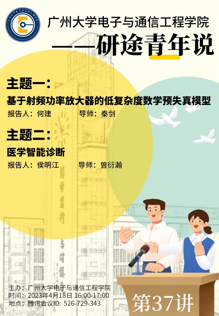 主办的“沿途青年说”第37讲于4月18日下午16:00-17:20在线上(腾讯会议:526-729-343)举行。本次主讲人为20级研究生何建,候明江,主题分别为基于射频功率放大器的低复杂度数字预失真模型和医学智能诊断。