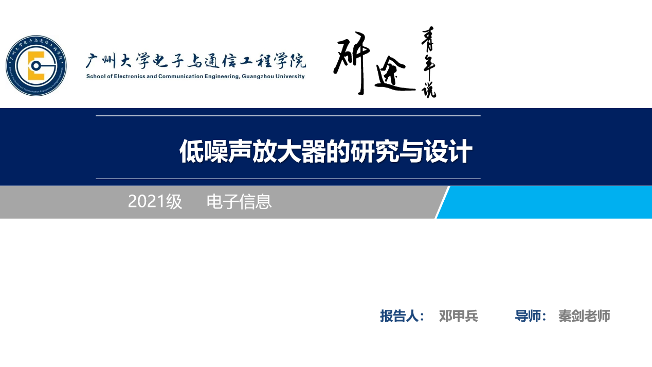 邓甲兵同学汇报的主题是低噪声放大器的研究与设计。他首先介绍了研究背景及意义。低噪声放大器在无线通信设备中的重要性,例如蓝牙耳机、无线广播、电视信号和通信基站等,特别强调了低噪声放大器对整个接收系统性能的影响。接着是现状与研究目标。描述了低噪声放大器的集成化、高频化和宽带化趋势,并设定了研究目标为设计一款具有自适应增益控制的超宽带限幅低噪声放大器。然后他介绍了研究内容与方法。介绍了二端口网络和S参数的基本概念,强调了输入输出驻波比、稳定性、噪声系数、增益和线性度等关键性能指标。详细讨论了设计的低噪声放大器和限幅器的技术细节,包括电路的稳定性分析、增益平坦度的优化和一体化设计的实施。最后,他总结了基于不同工艺(0.18um CMOS和0.15um GaAs pHEMT)设计的宽带低噪声放大器的主要成果。展望了在低噪声放大器的性能改进方面的未来研究方向,如采用噪声抵消技术和电流复用结构等。