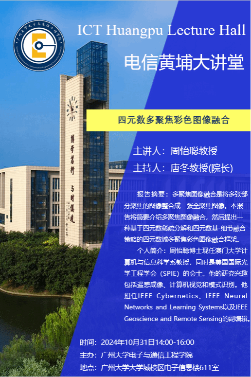 主办的电信黄埔大讲堂在大学城校区电子楼611举行,研究生于黄埔校区分会场博学楼(B1栋)105报告厅举行。本次大讲堂的主题是:四元数多聚焦彩色图像融合。主讲嘉宾为周怡聪教授。