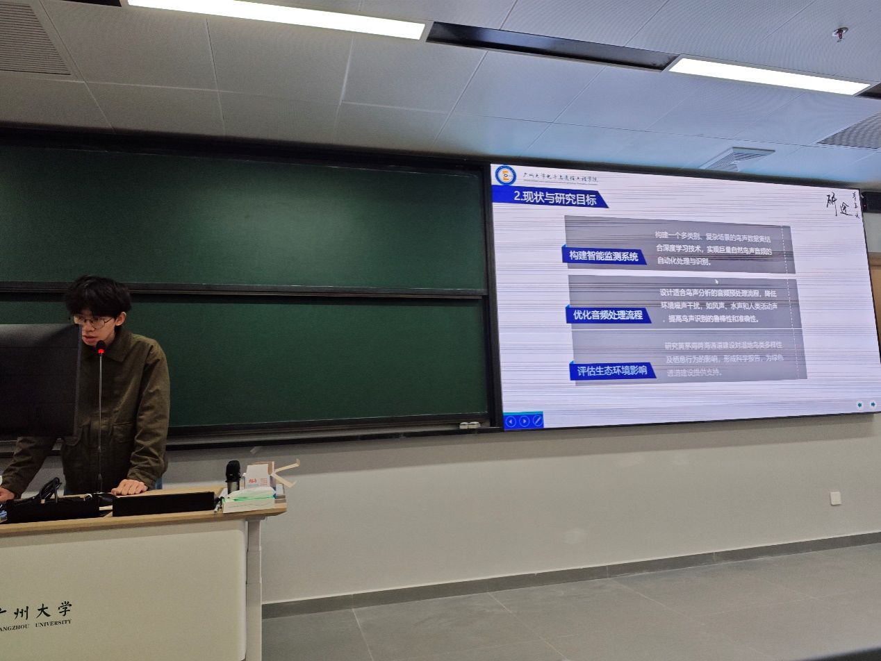 胡涛同学研究的主题是多类别鸟声监测与生态评估。在黄茅海跨海通道区域所进行的实地研究的目的在于促进人工智能领域与鸟声监测环境评估两个领域的交叉联系。在现实的复杂声学场景和生态环境中下的鸟声识别仍然是一个具有挑战性的问题,我们构建了一套完整的基于深度学习技术的鸟声识别框架,利用自动处理的结果对鸟类活动和行为进行了分析,通过长期监测鸟类物种类别和数量、活动节律的变化,探讨了黄茅海跨海通道的修建对区域鸟类生物多样性的影响。研究中还发现了一些鸟类在噪声环境中会显著提升其鸣声最低频率,这可能是行为可塑性的结果。