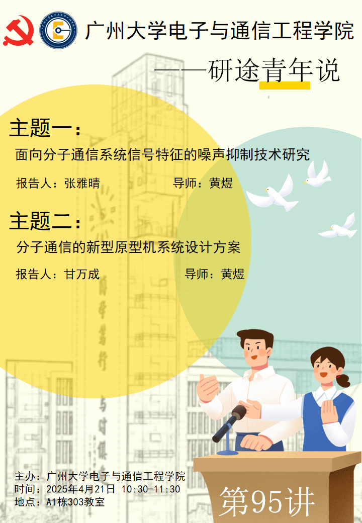 主办的“研途青年说”第95讲于4月21日10:30-11:30在黄埔研究院A1栋303教室。本次主讲人为研究生张雅晴、甘万成。
