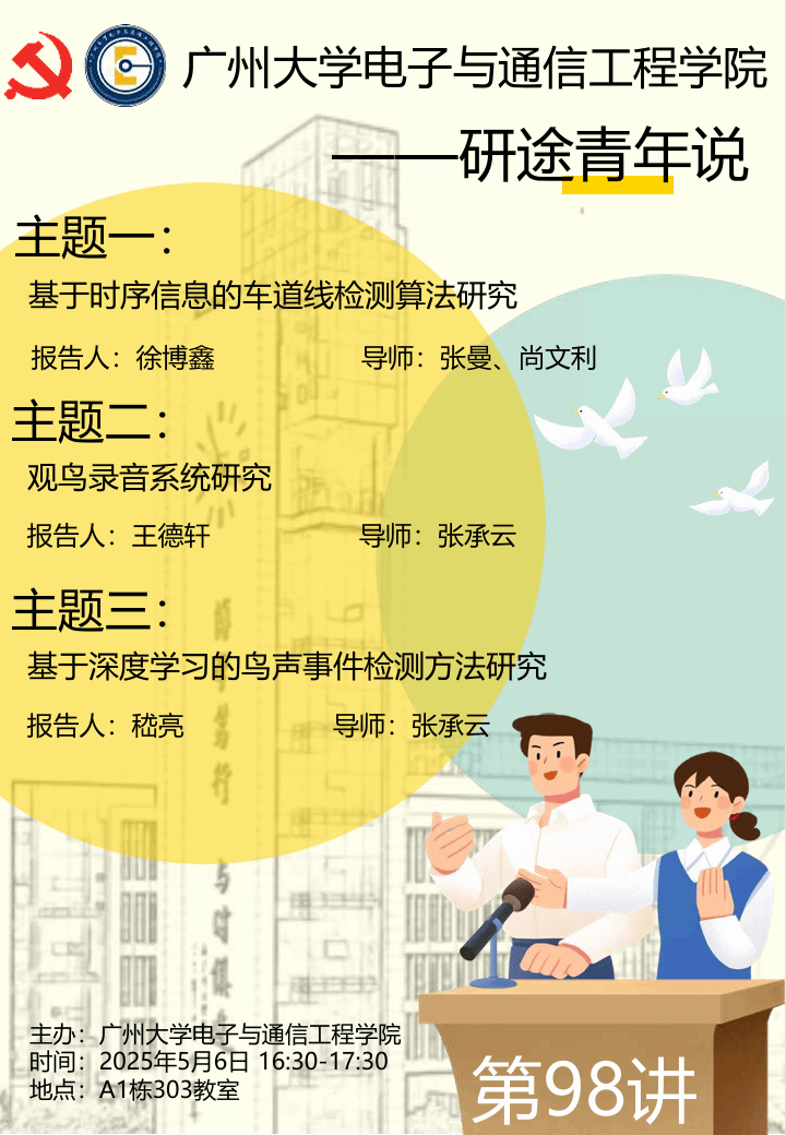 主办的“研途青年说”第98讲于5月6日16:30-17:30在黄埔研究院A1栋303教室。本次主讲人为研究生徐博鑫、王德轩和嵇亮。