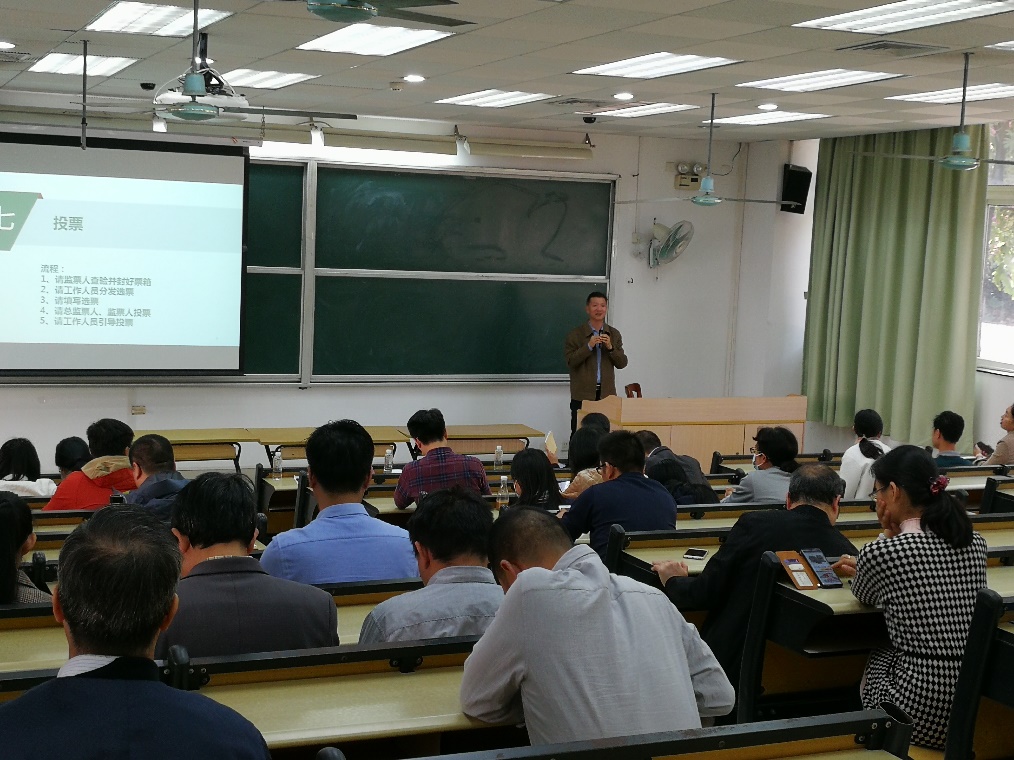 在理科南110召开学院分工会委员选举暨双代会候选人推荐大会,学院领导班子和全院教职工参加会议,会议由院党委书记陈泽龙同志主持。