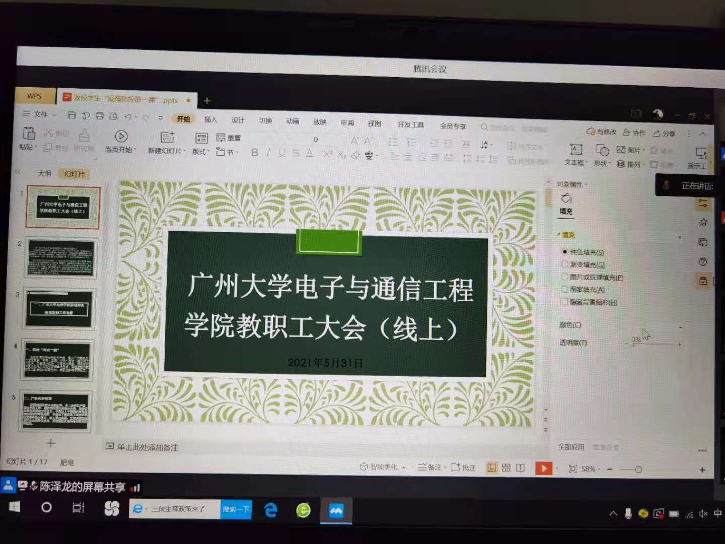 近期广州疫情防控形势复杂多变,为保障师生健康安全,5月31日晚上8点电信学院召开校园防疫、安全工作布置及学生就业工作线上会议,全体教职工参加了会议,会议由学院党委书记陈泽龙主持。