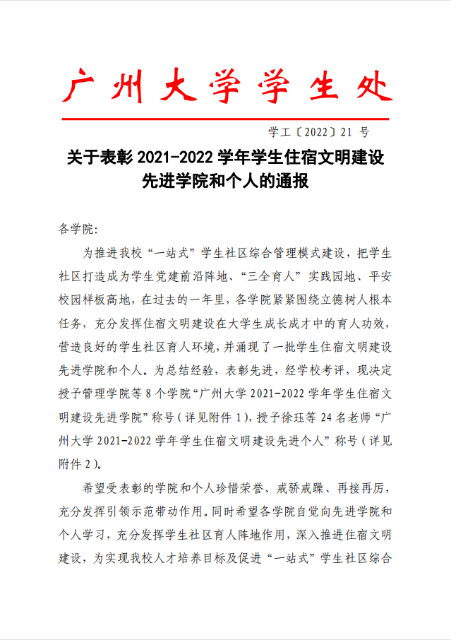 为推进我校“一站式”学生社区综合管理模式建设,把学生社区打造成为学生党建前沿阵地、“三全育人”实践园地、平安校园样板高地,在过去的一年里,各学院紧紧围绕立德树人根本任务,充分发挥住宿文明建设在大学生成长成才中的育人功效,营造良好的学生社区育人环境,并涌现了一批学生住宿文明建设先进学院和个人。