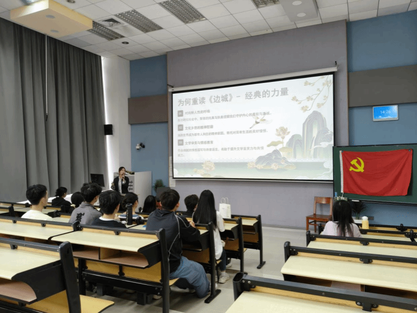 嘉宾导读结束后,学生第一党支部党员陈紫媚同学带来读书分享。陈紫媚同学剖析《边城》的创作背景,1934年的中国,正处于内忧外患的动荡转型期现代文明与传统农耕文明激烈碰撞。沈从文目睹都市文明中的虚伪与堕落,于是将目光投向故乡湘西,试图在文字中构筑一个未被现代“文明”玷污的纯净世界。茶峒镇的吊脚楼、龙舟赛,苗族与土家族的独特风情,不仅是故事的背景,更成为承载他理想人性的文化符号。