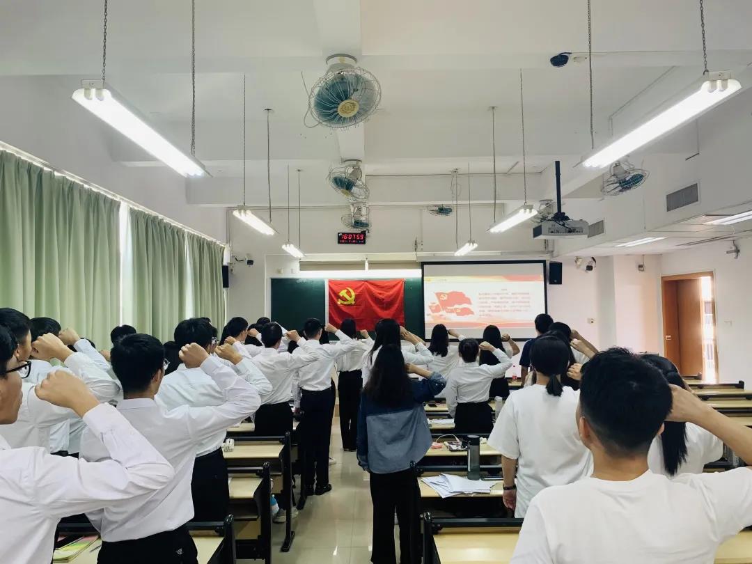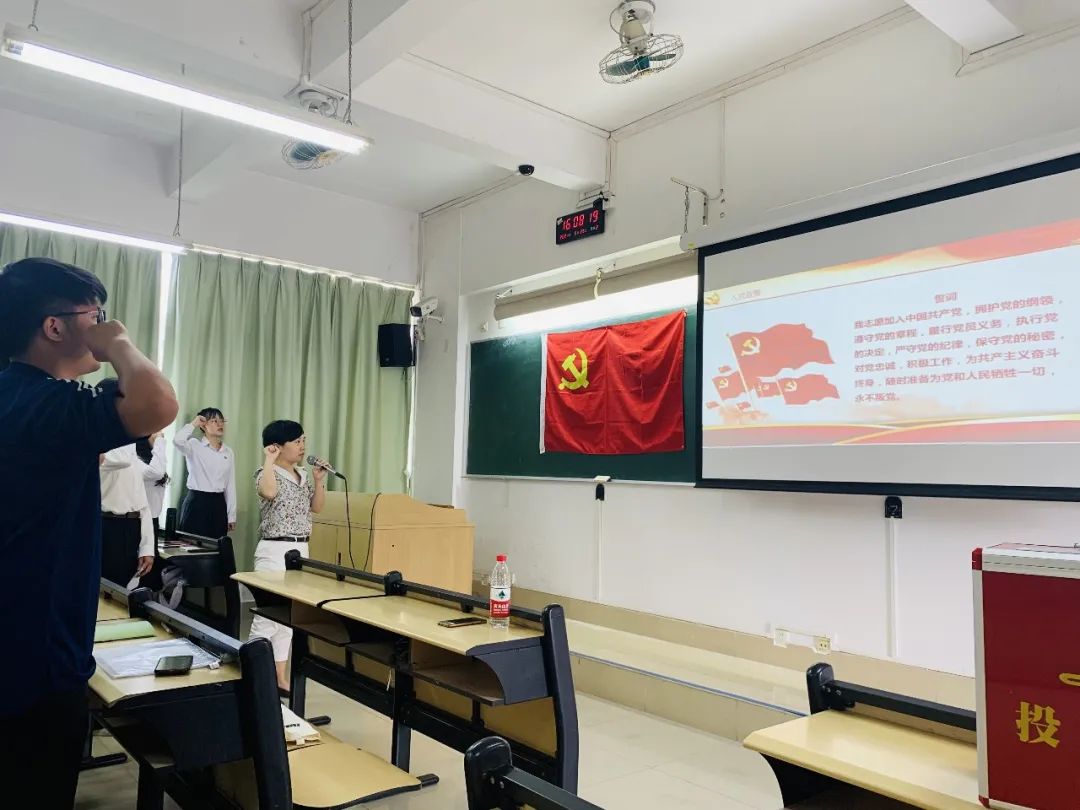 宣誓仪式上,新党员们着装整齐,在欧阳曦老师的带领下,面向党旗,许下铮铮誓言,严格要求自己,用中国共产党的思想武装头脑,发挥党员的先锋模范作用。