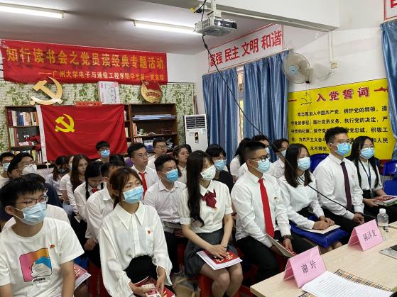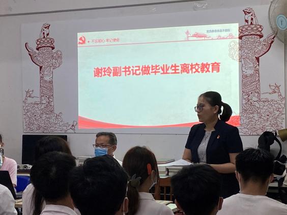 党委书记陈泽龙老师、党委副书记谢玲老师、学生第一党支部书记欧阳曦老师在学院的五室一站组织开展了“毕业党旗红”2021届毕业生党员离校教育会。