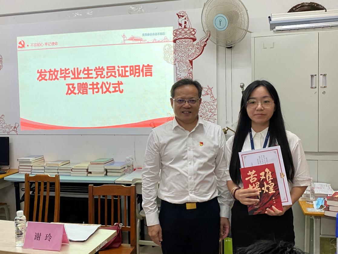随后,由学院党委书记陈泽龙老师为在场的毕业生党员颁发毕业生党员证明信,同时赠予金一南教授撰写的书籍《苦难辉煌》作为毕业礼物,希望同学们通过阅读好好学习改变与坚持、物质与精神、苦难与辉煌几组辩证关系,从苦难中去创造属于自己的辉煌。