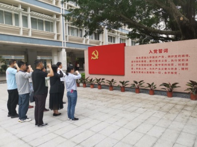 支部全体党员列队在宣誓广场上,在支部书记冯锦澎的带领下,庄严的举起右拳,在铿锵有力的宣誓声重温入党誓词,在心灵深处回想入党时的铮铮誓言,不忘初心、牢记使命。
