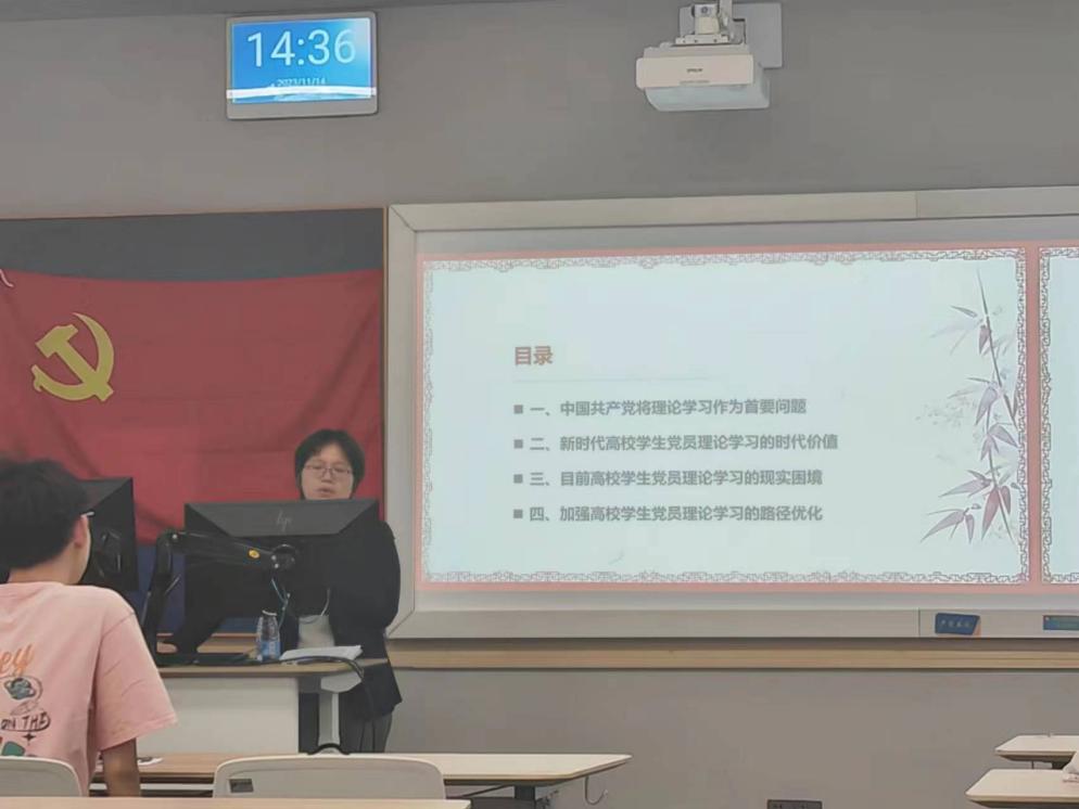 本次党课中,党委副书记谢玲从中国共产党将理论学习作为首要问题、新时代高校学生党员理论学习的时代价值、目前高校学生党员理论学习的现实困境、加强高校学生党员理论学习的路径优化四个方面进行重点阐述。
