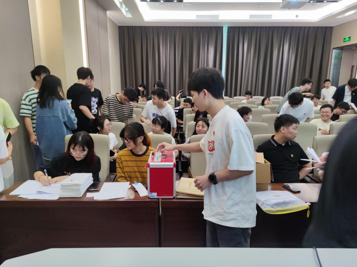 正式党员填写选票,依次上前投票决议。计票结束后,由邱君辉同志和陈韵婷同志分别宣读民主表决结果。
