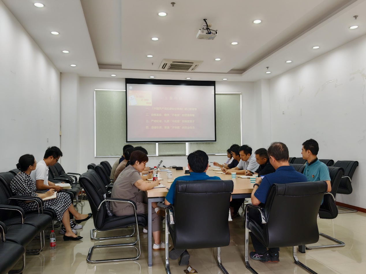 支部书记郑云龙首先领学了《中国共产党纪律处分条例》,他表示党纪学习教育是加强党的纪律建设、推动全面从严治党向纵深发展的重要举措,对于提升党员的政治定力、纪律定力、道德定力和抵腐定力具有重要意义。随后,郑云龙结合自身工作经历谈到了中国共产党员遵守相关规章制度的重要性,并且指出应对违规违纪保有警惕性。随后,结合《红线》等警示片,强化典型案例警示和教育作用,促进全体党员教师增强纪律意识、规矩意识。