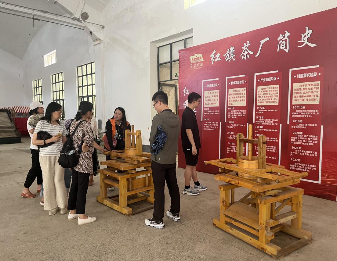 7月11日,活动的第二站广东英德红旗茶厂。英德红旗茶厂于1958年建成投产,是全国最早、规模最大的大叶茶制造厂,是当年中国红茶重要出口基地,曾肩负为国家创收外汇的重任,见证了新中国红茶产业化的发展历程。二十多米跨度的双曲砖拱结构车间,具有通风透气采光功能的萎凋车间,以及为后世茶厂工业设计提供蓝本的制茶设备。