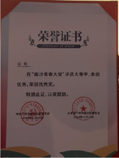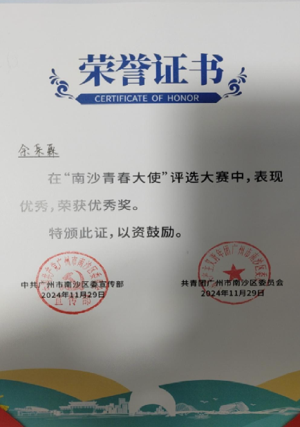 余采霖、周琦两位同学荣获“南沙青春大使”评选大赛优秀奖。决赛现场,两位同学和来自其他学校的选手逐一登台,通过个人先导片及PPT阐述,充分展现了青年候选人青春活力的形象和南沙活力之城、青春之城的城市风貌。她们的出色表现,不仅为学校争得了荣誉,也为南沙区的青年发展贡献了力量。