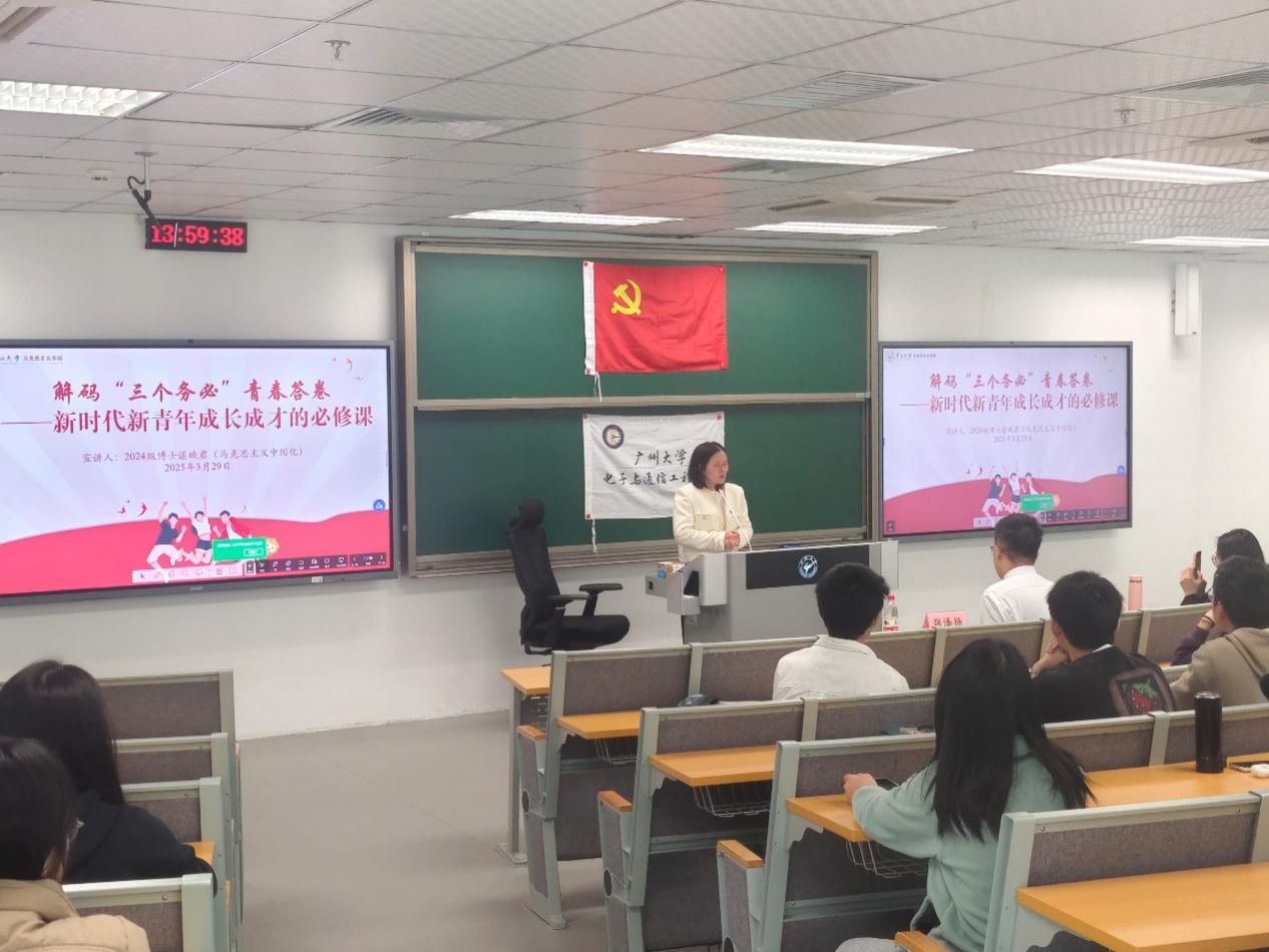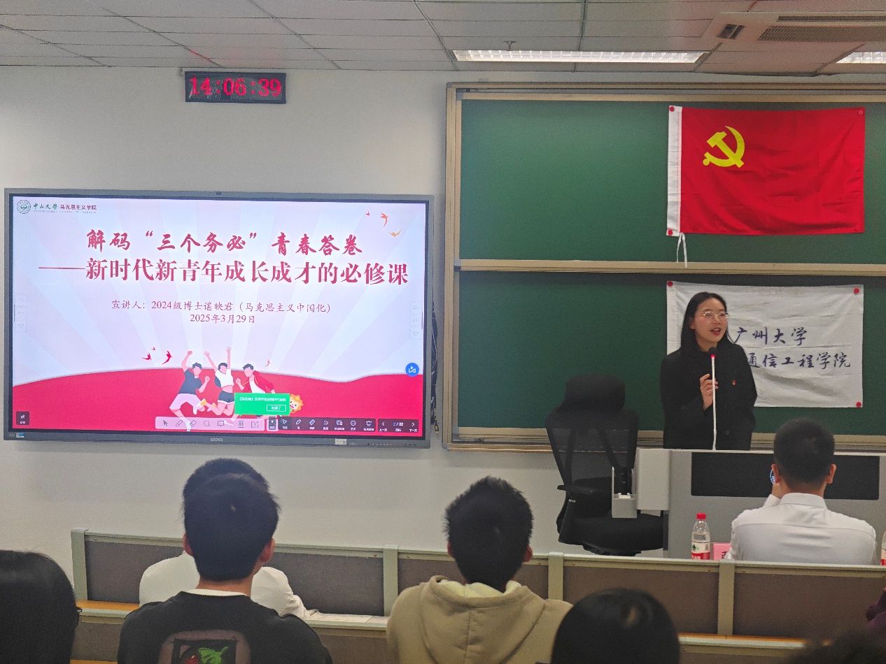 入党积极分子的党性修养,2025年4月1日下午,学院荣幸请到中山大学马克思主义原理博士生宣讲团成员谌映君和张泽扬在文渊楼305为同学们开展以“解码三个务必青春答卷”和“青年党员与党纪学习教育同行”为主题的专题讲座。
