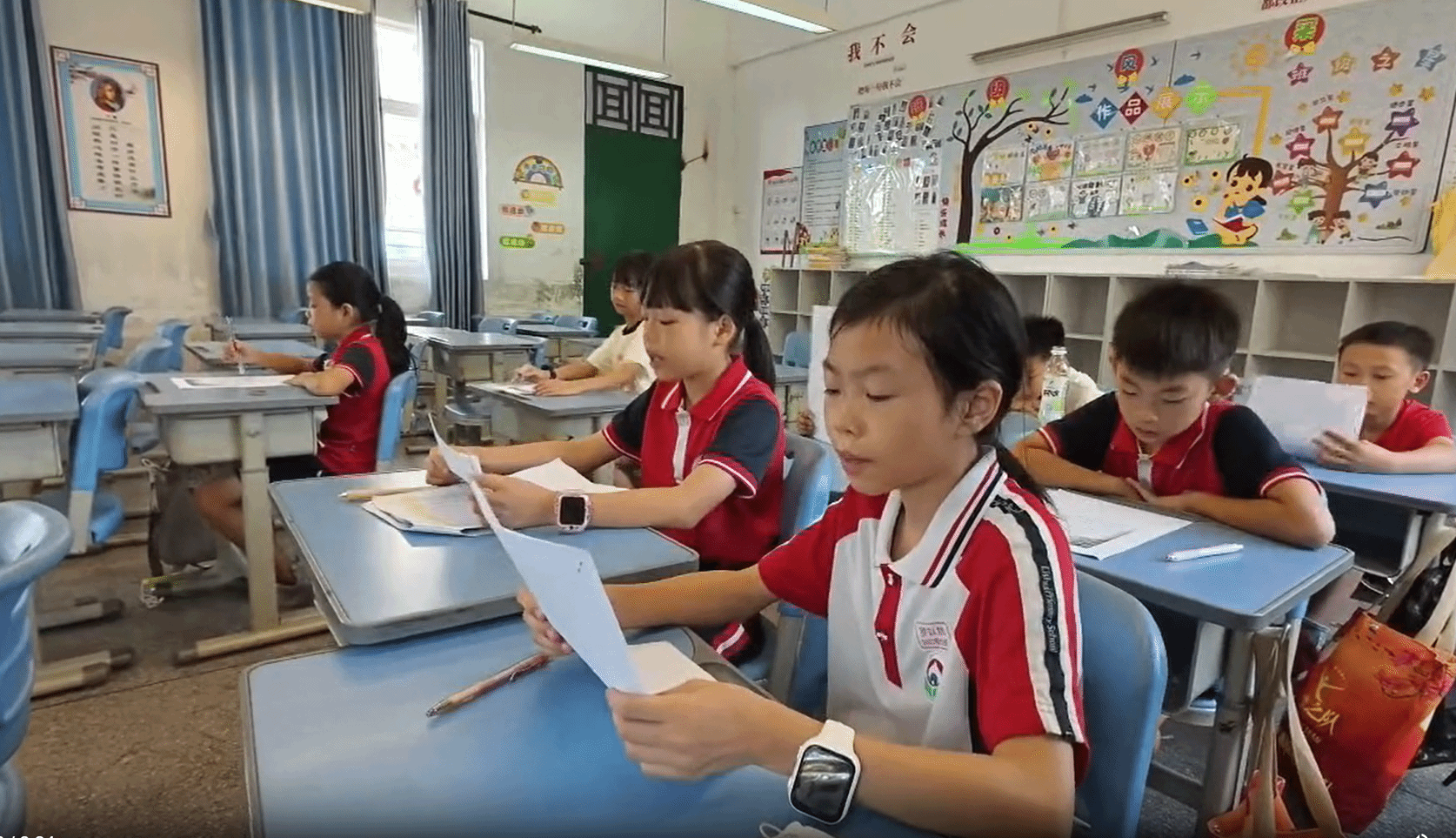 教室里,琅琅书声整齐洪亮,如清泉流淌。孩子们挺直腰背,目光专注于课本,稚嫩却坚定的声音交织,阳光透过窗户洒在课桌上,映着孩子们眼里的光,满溢着对知识的向往,尽显朝气与活力。