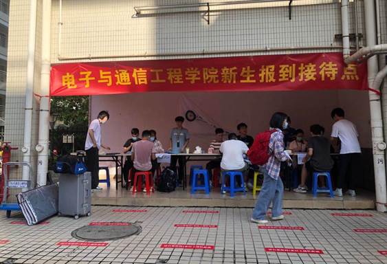 迎来了2020届新同学。据悉,今年学院共招收305名学生,分别来自广东、湖南、山东等多省市。学院陈泽龙书记、谢玲副书记、电子与通信工程系和物联网系陈庆春、曾衍瀚老师、2020级新生班班主任郑晖、承江红等老师来到学院报到现场,了解迎新工作情况,共同鼓励新生尽快适应大学生活,潜心学习,健康成长。