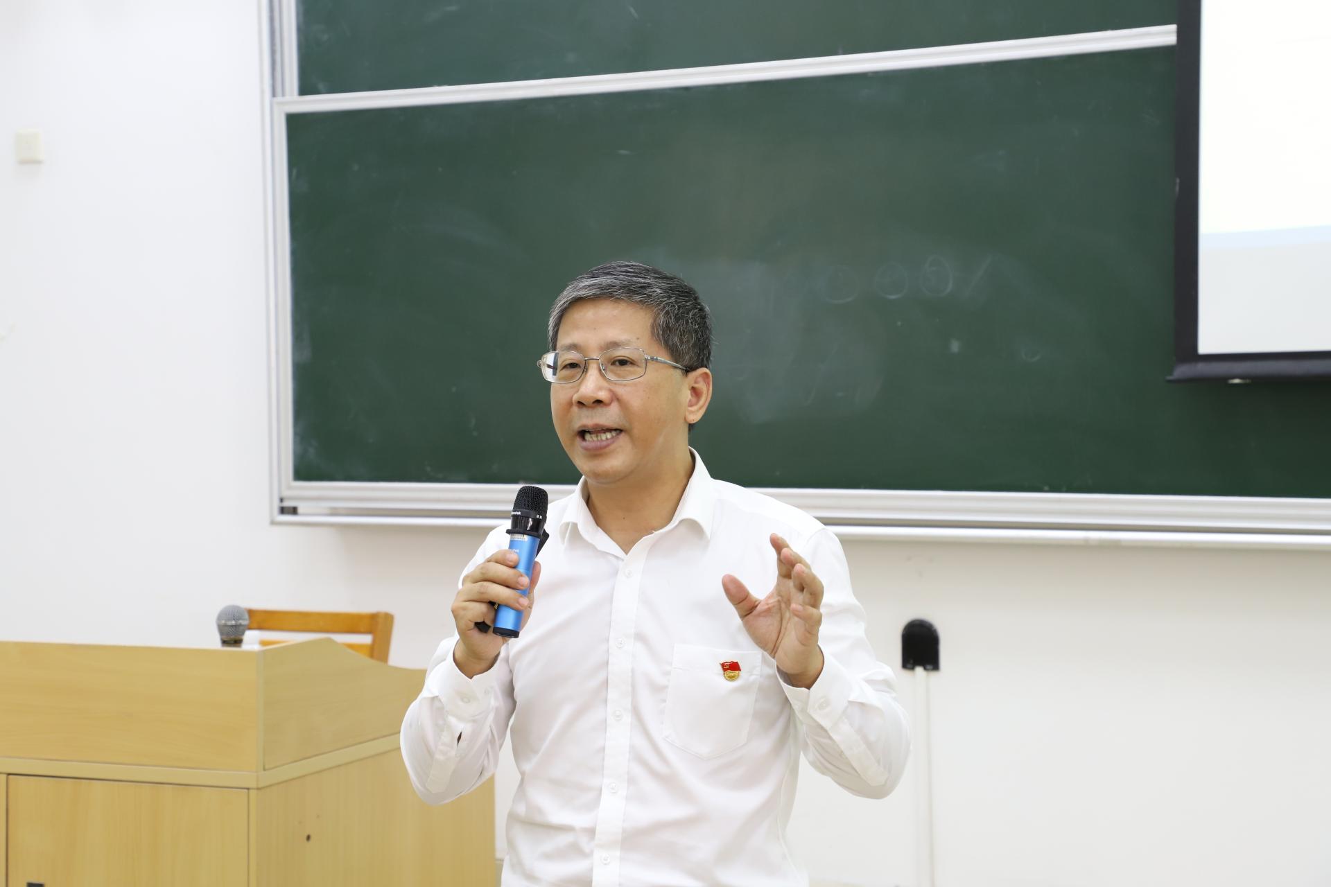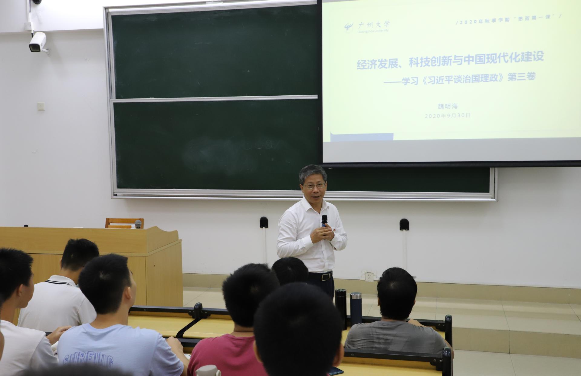 着眼于深入理解经济发展新格局,深刻认识科技创新在经济发展和中国未来发展、中国现代化建设过程中的重要作用,魏明海结合《习近平谈治国理政》第三卷中关于经济发展的内容,就党的十八大以来事关国家经济发展全局的重大判断进行了梳理,并援引大量实例,同时就党的十八大以来习近平总书记关于科技创新的地位、作用以及科技创新重大措施的一系列重要论述加以阐释,带领同学们深入理解科技创新始终是关系发展全局的重大问题,也是推动经济高质量发展的第一动力。结合广东战略性支柱产业、战略性新兴产业布局规划,他指出,同学们作为未来科技创新的生力军,“以创新破解各种难题是时代赋予你们的使命担当”“以创新破解各种难题为你们求学治学指明了方向”“以创新破解各种难题就是你们应该书写的大文章”。