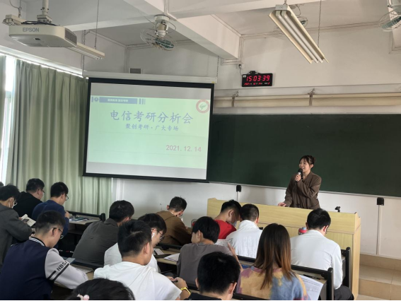 面对当前严峻的社会形势和就业压力,越来越多的同学考虑考研深造。为了帮助2019级大三的同学更好的规划自己的未来、解除疑惑、树立考研信心,电信学院考研协会于2021年12月14日下午在文新楼618举办了考研备考分析会。此次考研分析会邀请到了聚英教育/聚创考研的老师们,为同学们答疑解惑,讲解考研规划相关事宜,提供经验介绍与指导,2019级辅导员王沁芳和年级80多名学生参加。
