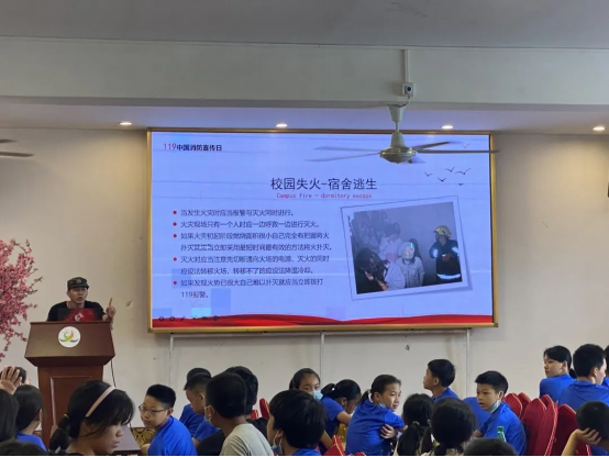 消防安全教育杨润城教官为同学们演讲:失火逃生教学以及教室逃生。