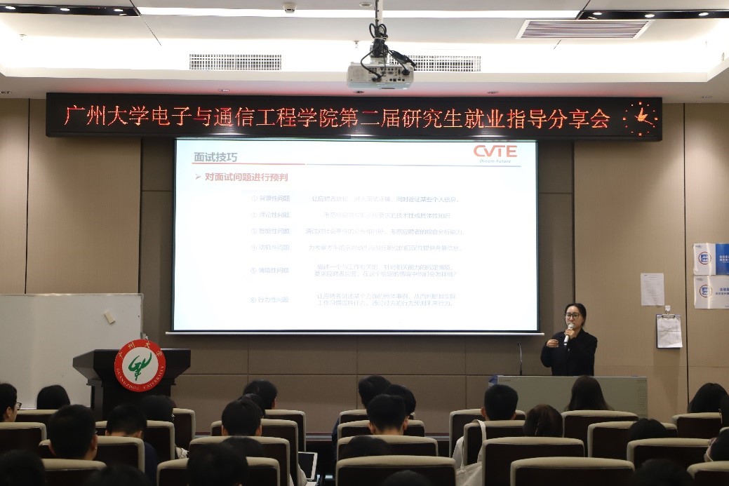 第一位主讲嘉宾是广州视源电子科技股份有限公司的校园招聘经理付娆。付娆经理给同学们从HR的角度总结了面试技巧,其中特别提到了应该从了解自己、了解企业和了解应聘岗位三个方面去准备招聘面试。最后还对公司进行了简单介绍,并且现在2023届/2024届招聘正在火热进行中。