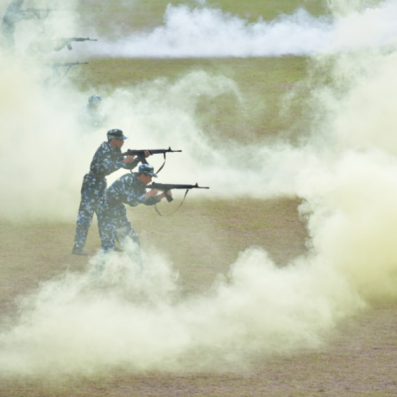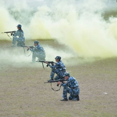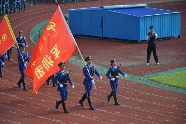 铿锵的口号在军训汇演的场地响起,每一句口号都回荡天际,每一次落脚都坚定有力。